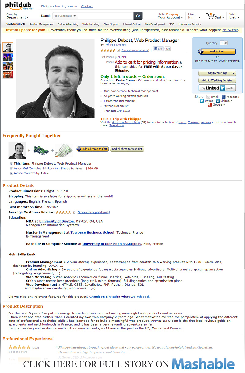 Dubost, a web product manager currently based in Paris, is looking to travel for his next position. So he decided to make his CV stand out anywhere in the world - by mimicking an Amazon product page."