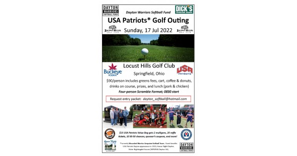 The USA Patriots will not be coming to the Dayton area in 2022 but look to make a return in 2023.  In preparation for their visit next year, two golf outings will be offered to help raise funds for hosting:  Sunday, 17 July, at Locust Hills Golf Club, just south of Springfield, and Friday, 30 September, at Beavercreek Golf Club.
