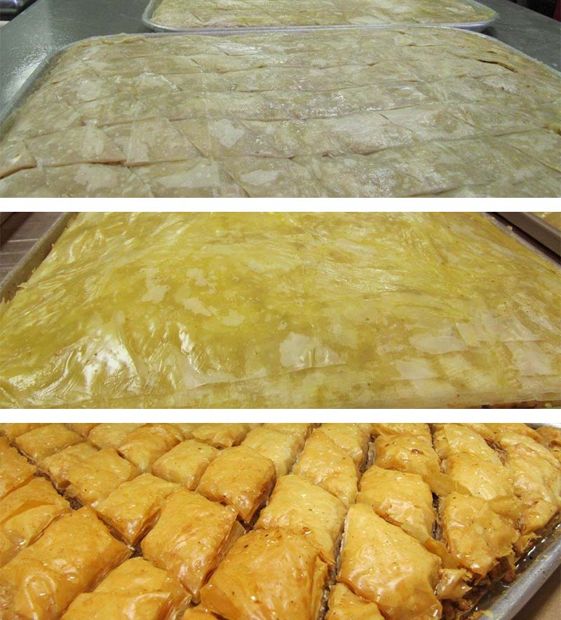 The smell of butter on arrival was unmistakable. It came as no surprise that every paper thin layer of phyllo pastry dough was generously coated with clarified butter. Two pounds of phyllo, two pounds of processed walnut spice mixture, and untold amounts of butter make up each pan. They make it look easy; though admit the process is very time-consuming.