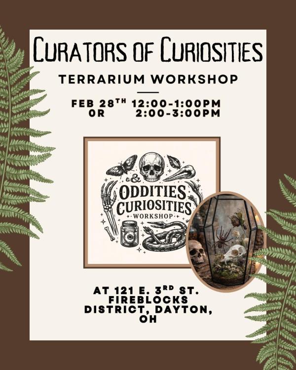 Curators of Curiosities Workshop is taking place at Now and Zen DIY Studio, which is located at 121 E 3rd St in Dayton. Now and Zen DIY Studio - Stop in and create your own terrarium featuring an array of air plants, succulents and ferns. Our fully loaded Terrarium Bar offers an abundance of shells, stones, moss, soil, crystals, etc.