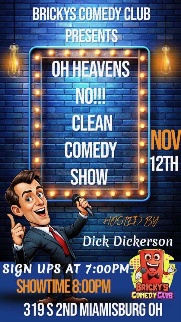 Clean Comedy Show is taking place at Bricky's Comedy Club, which is located at 319 S 2nd St in Miamisburg. Bricky's Comedy Club - Bricky's Comedy Club is a live comedy venue featuring some of the best up-and-coming comedy acts from around the Midwest and surrounding regions.
