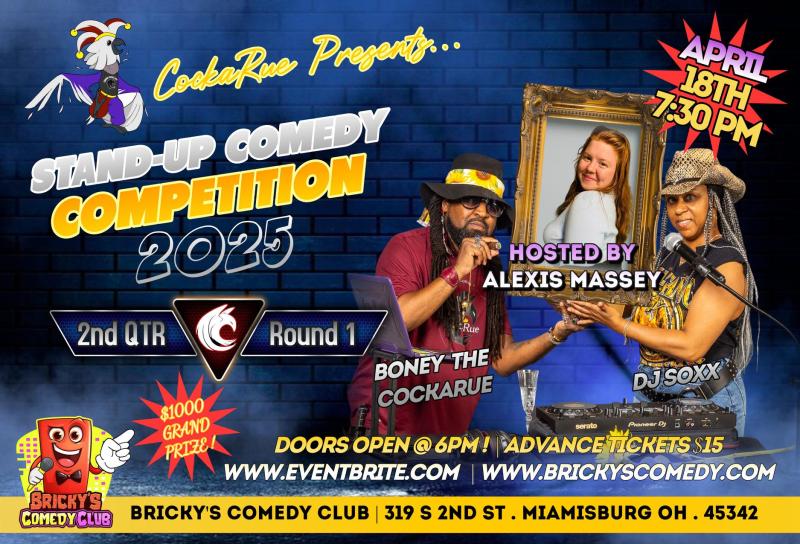 CockaRue Stand-up Comedy Competition - 2nd Qtr / 1st Round is taking place at Bricky's Comedy Club, which is located at 319 S 2nd St in Miamisburg. Bricky's Comedy Club - Bricky's Comedy Club is a live comedy venue featuring some of the best up-and-coming comedy acts from around the Midwest and surrounding regions.