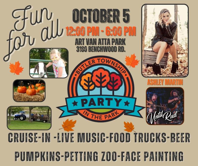 This year Butler Township's fall festival, Party in the Park, and Cruise-In to Butler Township combine for a full day of fun for all ages! Live music from Until Rust (Noon-2:30 pm) and Ashley Martin (3pm to 6 pm), lots of cool cars, food trucks, craft beer and domestics provided by the Vandalia-Butler Chamber of Commerce, and FREE kids activities including; pumpkin picking and painting by the Vandalia-Butler Optimist Club and Octagon Club kids, petting zoo, face painting, balloon twisting and tractor-pulled wagon rides by Butler Township Service Department!