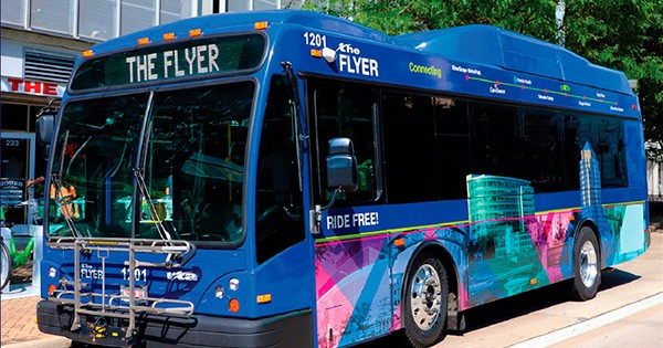 The Flyer is a new, free, circulator shuttle from the Greater Dayton RTA that provides easy access to offices, local dining, nightlife, entertainment, parks, hotels, parking, and all that downtown Dayton has to offer. The eco-friendly shuttles run on a continuous loop, stopping at each shuttle stop approximately every 10 minutes.