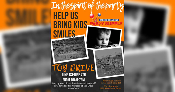 Toy Drive for Tornado Victims is taking place at Special Occasions Party Supply, which is located at 1215 E. Stroop Road in Kettering. Special Occasions Party Supply - Family-owned party store with party supplies for birthdays, holiday parties, anniversary celebrations, graduations, baby and bridal showers, wedding receptions, more. Costumes in stock all year!