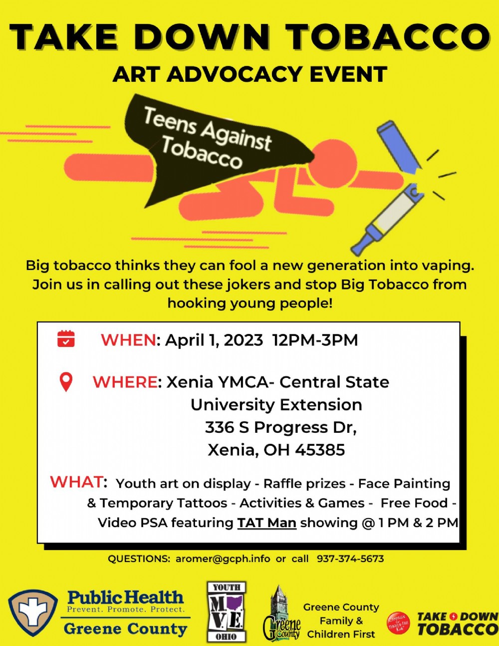 On April Fool's Day, Greene County Public Health (GCPH) is partnering with Greene County Family & Children First and youth group TAT: Teens Against Tobacco, to host an event for Take Down Tobacco National Day of Action, a nationwide movement to stand up and speak out against the tobacco industry. Youth art will be on display, advocating for a vape-free future along with raffle prizes, Take Down Tobacco online games, face painting & temporary TATtoos, activities and games, food, and video showing of TAT Man and Oxygen Boy at 1pm & 2pm.