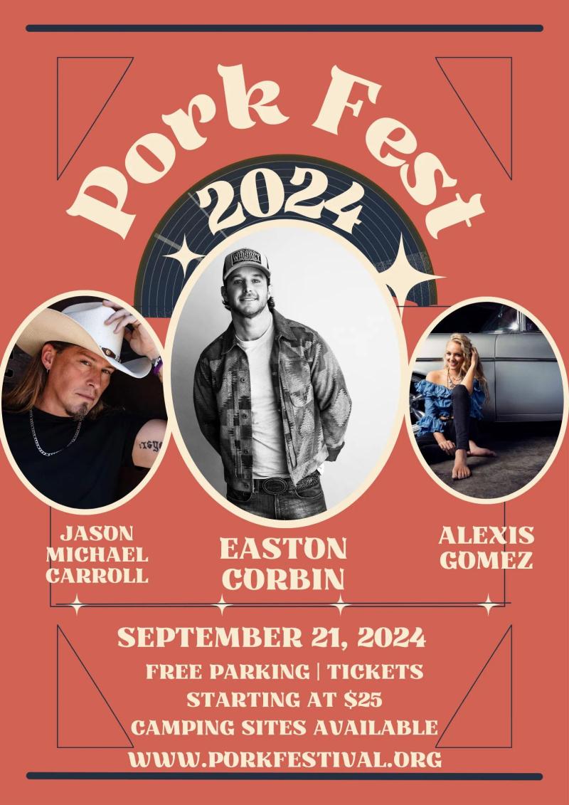 Join us on September 21st for the Pork Fest at the Preble County Fairgrounds for a country music extravaganza with the one and only Easton Corbin headlining the festival!” And that's not all! Special guests Jason Michael Carroll and Alexis Gomez will also be hitting the stage to keep the party going all night long!