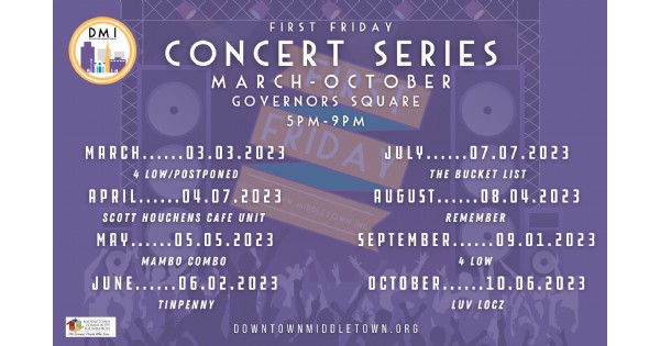 Bring your lawn chairs and come ready to dance! The First Friday Concert Series in Governors Square, Middletown March - October.