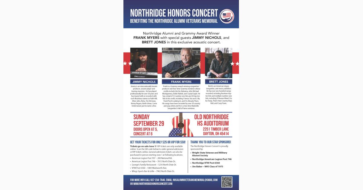 The concert takes place on Sunday, September 29th at 6:00 at the auditorium at the old Northridge High School located at 2251 Timber Lane, Dayton, OH 45414. The concert features Grammy-award winning songwriter and producer Frank Myers, renowned session player Jimmy Nichols, and hit songwriter Brett Jones. Tickets are only $25 to this special acoustic concert to keep the Northridge Alumni Veterans Memorial going!