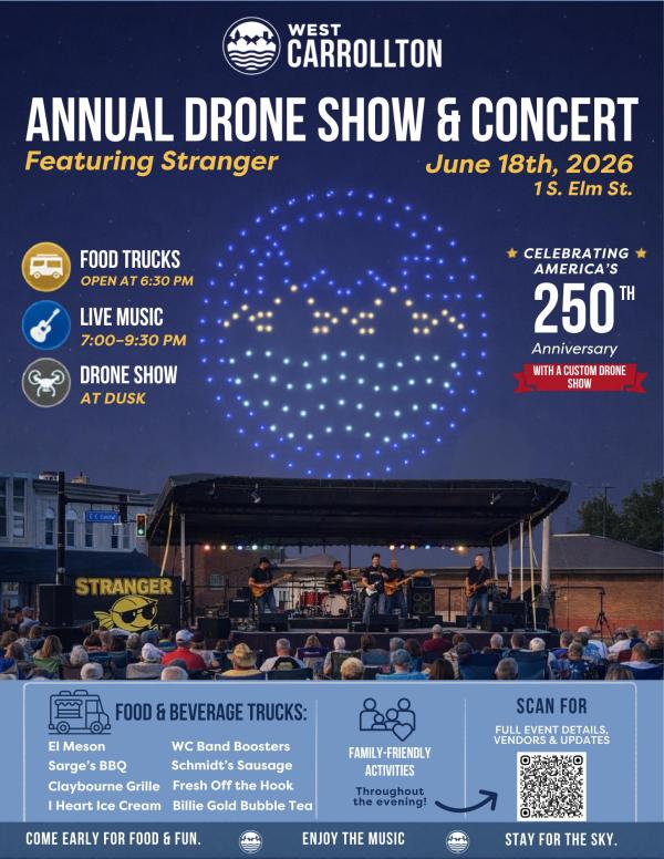 The concert and drone show will kick off West Carrollton’s celebration of America’s 250th anniversary, featuring a custom-designed, 250th-themed drone show that honors our past, celebrates our present, and looks ahead to the future of our community. It’s quickly become a community favorite, and this year it will be a moment you won’t want to miss. Come early for the music. Stay for the sky. There is plenty of space to relax, enjoy the music, and spend time with family and friends.
