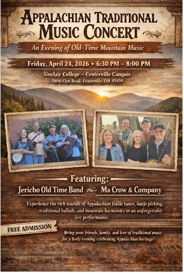Traditional Appalachian Music concert is taking place at Sinclair Community College’s Centerville Campus, which is located at 5800 Clyo Rd in Centerville. Sinclair Community College’s Centerville Campus - Sinclair in Centerville offers a nationally recognized community college education right at your doorstep.