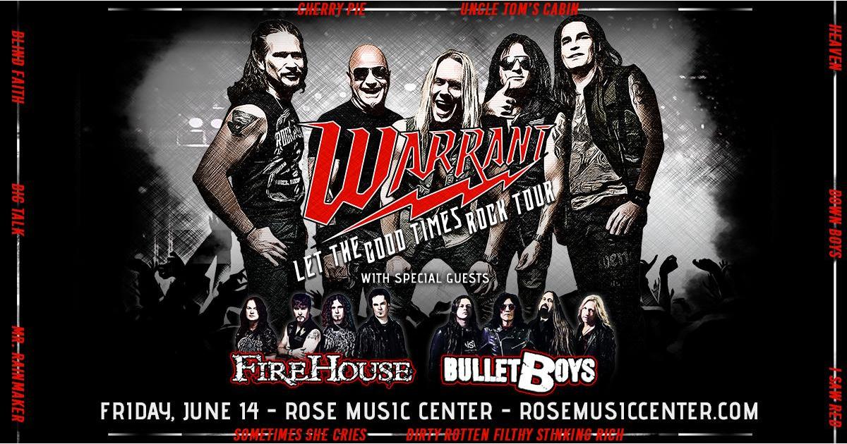 WARRANT is excited to bring ROCK back to Huber Heights, OH! On Friday, June 14, WARRANT will bring their “Let The Good Times Rock” Tour to Rose Music Center at The Heights with special guests FireHouse and BULLETBOYS.