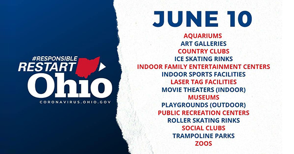 Ohio Governor Mike DeWine today announced the reopening of certain facilities including certain entertainment facilities with health and safety restrictions.