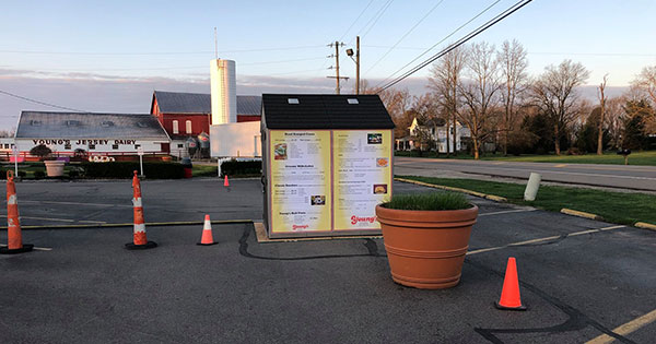 "When you arrive, follow the signs to the order booth located in front of the Dairy Store in the parking lot, place your order (one of our amazing Staff will be there to take your order), then pull around to the pickup area located in the back of the store and be on your way. We understand this limits some menu choices. We feel this is the best way to get through the month of April while we keep Young's open, some of our Staff employed, and doing our part to keep everyone safe."