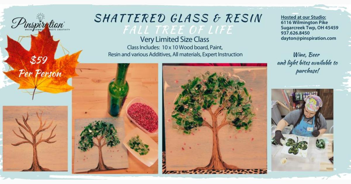 We are incredibly excited to announce a new workshop at the studio titled “Shattered Glass & Resin!” This class will center around creating a seasonal design using vibrant broken glass on a 10”x10” wooden canvas panel, which will be sealed with resin for a breathtaking final artwork. The glass offerings will vary as we source from different locations, but you are always welcome to bring your own glass to break in the studio. We will assist you in effectively applying resin to ensure a beautiful end product that you can hang and enjoy. Please remember that all pieces will need to remain in the studio for 48 hours to cure appropriately.