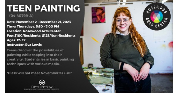 Teen Painting at Rosewood Arts Center is taking place at Rosewood Arts Centre, which is located at 2655 Olson Drive in Dayton. Rosewood Arts Centre - Rosewood Arts Center is dedicated to enriching the quality of life for the residents of Kettering and the greater Dayton area by providing creative experiences through the arts.