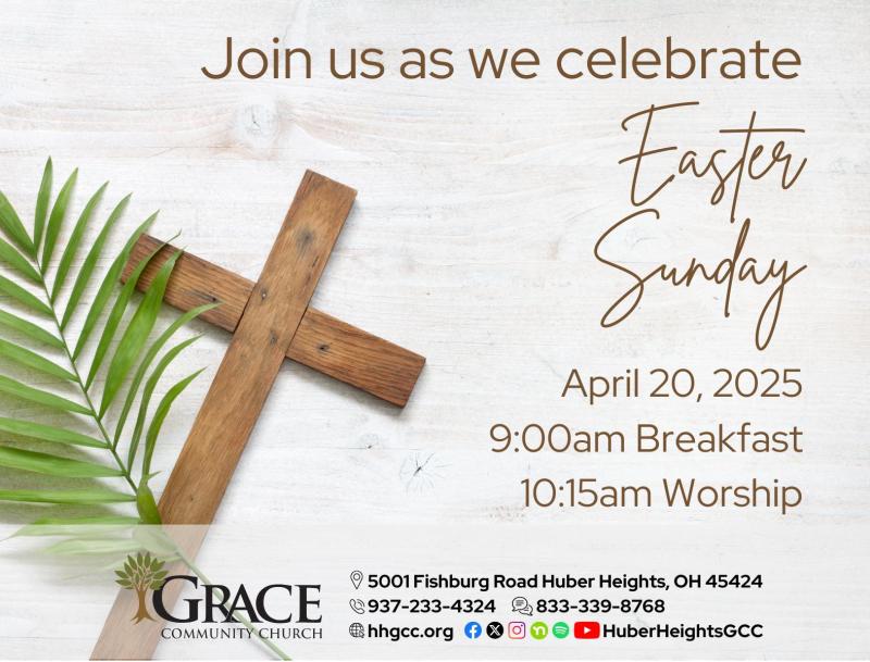 Easter Sunday Celebration at Grace Community Church is taking place at Grace Community Church, which is located at 5001 Fishburg Road in Huber Heights. Grace Community Church - Grace Community Church is a Grace Brethren church in Huber Heights, Ohio, near Dayton. We are community of believers focused on exalting God and encouraging people.