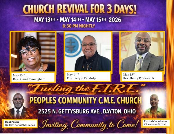 3-Night Revival at Peoples Community C.M.E. Church, May 13–15, 2026, 6:30PM nightly. 2525 N. Gettysburg Ave, Dayton. Come be inspired—Fueling the F.I.R.E.! All are welcome!