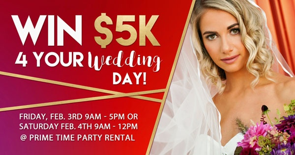 Come to Prime Time Party Rental February 3 & 4 to claim your "$5k for Your Day" raffle ticket and pick up FREE tickets to our March 4 Bridal Open House!