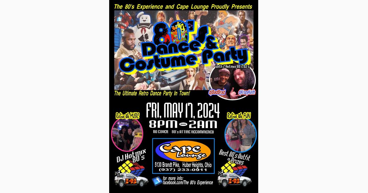 80S Costume and Dance Party is taking place at Cape Lounge, which is located at 5130 Brandt Pike in Huber Heights. Cape Lounge - Bar located in Huber Heights