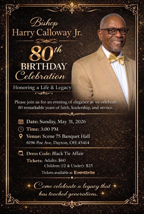 Friends and Family; You all are warmly invited to celebrate a very special milestone—the 80th Birthday of Bishop Harry Calloway Jr. Join us as we honor a life of faith, service, and dedication. This joyful occasion will be filled with fellowship, gratitude, and cherished memories as we celebrate eight decades of blessings. Your presence would mean so much as we come together to show love and appreciation for Bishop Calloway and the incredible impact he has made in our lives and the Dayton community as a whole! Please spread the word, share the flyer and grab your tickets! We look forward to celebrating this remarkable milestone with you! Much love and many blessings to everyone!