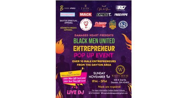 The Black Males United Entrepreneur Pop Up event is hosted by Damaged Heart and will be held on Sunday, November 1st from 1:00pm-5:00pm at the White House Event Center, 101 E Second Street, Dayton, Ohio 45402. This is a time for black males to come together and showcase their talents.