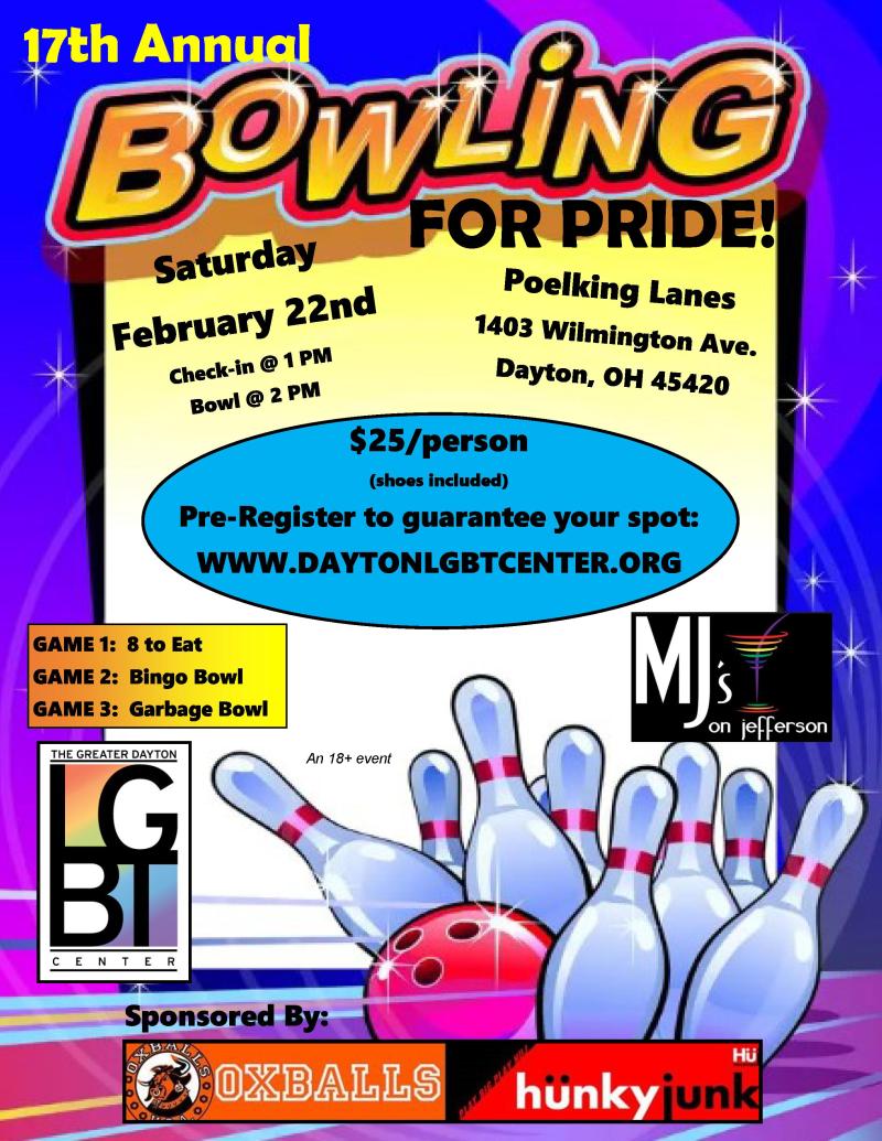 Join us for the 17th Annual Bowling for Pride fundraiser. Tickets are $25 per person and it includes the shoes. Fabulous prizes and great fun! BOWLING For Pride is sponsored by The Greater Dayton LGBT Center.