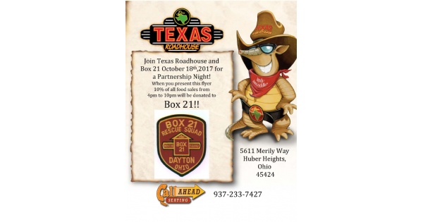 Visit The Texas Roadhouse for dinner and visit with members from Box 21, see our equipment, and help raise funds for new equipment, supplies, and operating expenses.