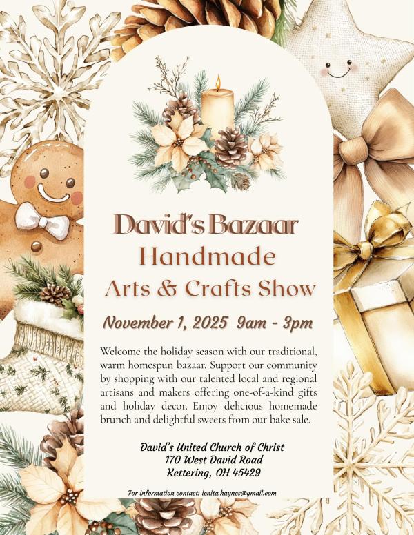David's Holiday Bazaar is taking place at David' s Church (UCC - Kettering), which is located at 170 West David Road in Kettering. David' s Church (UCC - Kettering) - David's Church is a progressive Christian community where FAITH comes to LIFE!