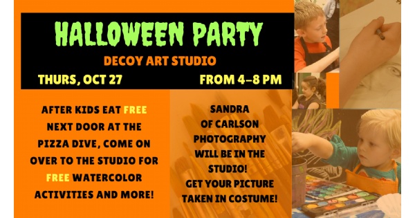 Drop by the Beavercreek Pizza Dive next door for FREE pizza for kids in costume ages 0-10, and then come on over to Decoy Art Studio for FREE watercolor art projects and so much more!
