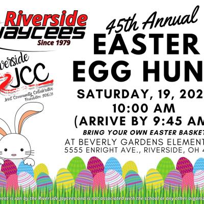 45th annual Riverside Jaycees Easter Egg Hunt Saturday, April 19 - 10am, arrive by 9.45. Bring your own Easter Basket!