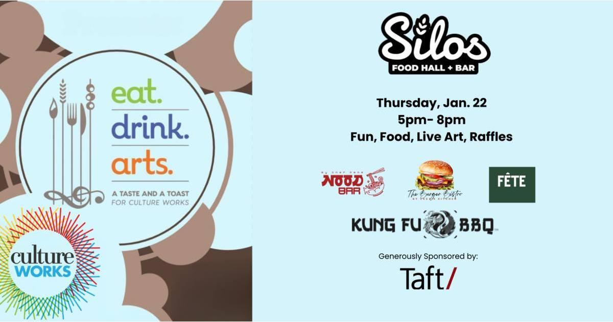 Food, raffles, prize drawings, and live art experiences at Eat. Drink. Arts.at The Silos! Benefiting Culture Works' mission to support arts organizations and artists across the Dayton Region