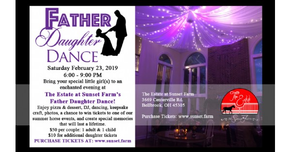 The Estate at Sunset Farm's Father Daughter Dance Saturday February 23, 2019 6:00-9:00 PM Enjoy pizza & dessert, DJ, dancing, keepsake craft, photos, prizes, & life long memories!