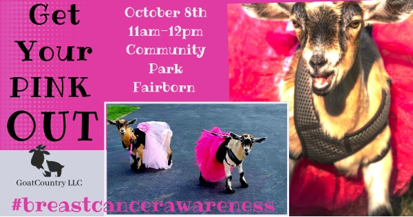 Come do yoga...with goats. Goat Country LLC is bringing our mini goats to Fairborn parks for day(s) of fitness, fun, cuddling and little bit of silliness. The goats will be in pink!