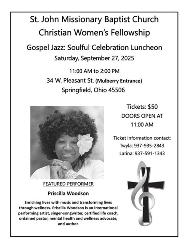 The Gospel Jazz Luncheon, set to take place on Saturday, September 27, at St. John Missionary Baptist Church 34 W. Pleasant St. (Mulberry Entrance) Springfield, Ohio 45506, from 11:00 am to 2:00 pm.