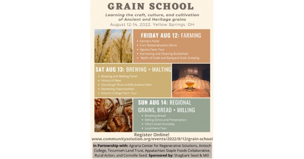 Agraria Center for Regenerative Practice has collaborated with Tecumseh Land Trust, Antioch College, Cornville Seed, Appalachian Staple Foods Collaborative, and Rural Action to offer a 3-day Grain School to our friends in the Midwest on August 12-14, 2022. Over the course of three days, participants will have hands-on experience on the topic of Ancient Heritage Grains. Join us for farmers panels, beer tastings, baking demos, and lectures on various grain related topics such as The History of Beer and Dispelling the Myth of Backyard Grains. Come for one day or all three days!