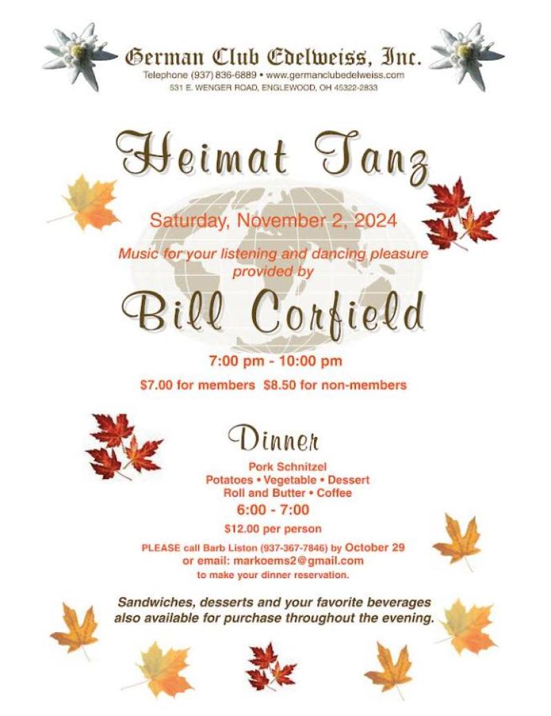 The German Club Edelweiss Invites you to our Heimat Tanz (Homeland Dance) on Saturday November 2, 2024 from 6 PM to 10PM.