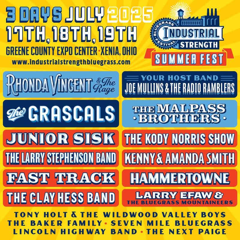 The inaugural Industrial Strength Bluegrass SUMMER FEST July 17th, 18th & 19th, 2025 Xenia, OH. Join us for our award-winning, family-friendly music festival featuring the best in bluegrass and American roots music.