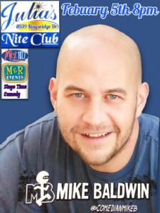 Join us at Julia's Night Club February 5th at 8pm, for their FREE Comedy Night, featuring the hilarious Mike Baldwin! Hosted by Jonathan Craig. Presented by M&R Events, and Stage Time Comedy.