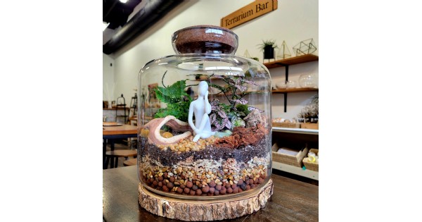 You'll begin with a beautiful large or medium glass vessel. Then select from a variety of plants, stones, accents & embellishments. Knowledgeable staff on hand to help you create a terrarium ecosystem that's perfect for YOU!