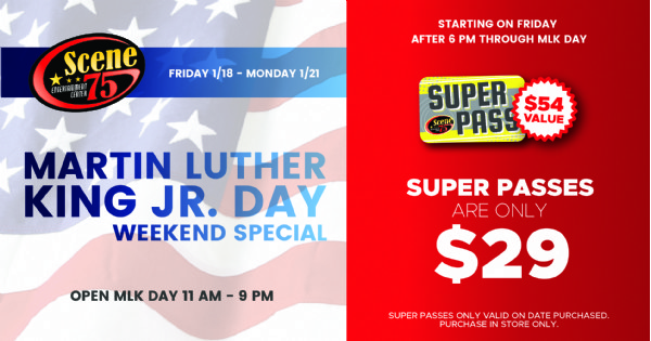 Scene75 will be open on Martin Luther King Jr. Day from 11AM – 9PM! We will also be offering a discount on our best deal- our Superpass package! This package will be sold at $29!