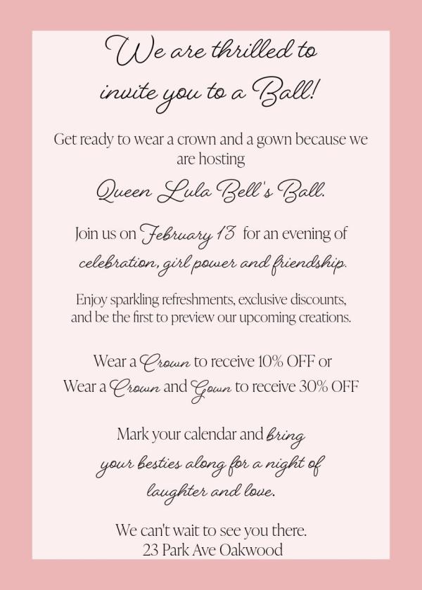 You are invited to a Ball! Wear a crown and a gown to Queen Lula Bell's Ball on February 13 from 5 to 8 p.m. for an evening of celebration, girl power, and friendship.
