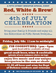 Bring your family and friends to Fifth Street Brewpub's Red, White & Brew cookout on Friday, July 4 11 am - midnight! Delicious BBQ from 1 - 6, with FSB pub food available all day long. Great craft beers on tap, including a variety of summer selections. Wine and cocktails. Live music. And the biergarten is open so you can enjoy the sun AND the shade. $1 off beer and wine to all Dept of Defense employees and to US veterans.