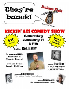 Kickass Comedy Show at Jackass Flats 6024 Rip Rap Rd., Dayton, Ohio 45424 (937) 236-4329. Headliner comedian Rob Haney seen on HBO, Showtime, Comedy Central, heard on Bob and Tom. Rob also has the distinction of previously being a writer for the Jay Leno Tonight Show. Feature Jesse Nutt. Jesse also has been on HBO, Showtime, Comedy Central and Bob and Tom. Special guest Jeremy Johnson seen at Wiley's Comedy Club, the Funny Bone and the winner two years in a row Dayton's funniest comedian. Host and emcee Tracy Cooper, Tracy took honors in the San Antonio All Star Comedy Jam and recently toured in Georgia and Florida. Tickets can be purchased at Jackass Flats. It is a good idea to get your tickets in advance. Special food and rink prices the night of the show.
