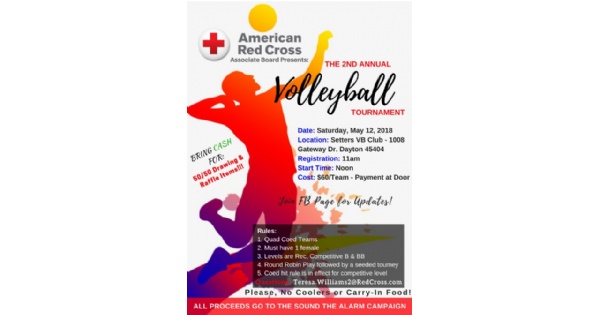 THE RED CROSS DAYTON CHAPTER ASSOCIATE BOARD AND SETTER'S VOLLEYBALL CLUB WOULD LIKE TO INVITE YOU TO OUR FUNDRAISING SAND VOLLEYBALL TOURNAMENT. ALL PROCEEDS WILL GO TO OUR "SOUND THE ALARM" CAMPAIGN PROMOTING FIRE SAFETY AND INSTALLATION OF SMOKE ALARMS IN OUR COMMUNITY .