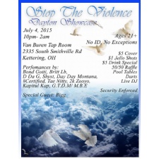 What's Going On In Dayton Ohio and Daryl Dalton Productions Intl 4 Of July Stop The Violence Dayton Showcase We Will Have A variety Of Ohio Artists Of All Kind's that Will Be Performing. Each Artist's Will Have 15 to 20 minutes This Event Is To Bring awareness To @[null:#DaytonOhio]]] For all to come Together Ass One City There Will Be Free Food, $1 jello shots, $5 Drinks Special, Corn Hoe, Best Artists performance, 50/50 raffle and More Performances By Bond Gotti Day Day Montana, Tae Nitty, Britt LB Yung Shyst Damien Shawn Franklin Stephon Zooyo Hammett Holla Boy Slim Alstork @[null:#Certified]]] Kapitul Kap Special Guest Performance By Biggie Wefocusent And Many More To be announce $5 Cover Security Enforce Smoking Friendly Patio No Drug's 21 & Up With I'D No Exception Keep The Drama At Home It Will not be Allowed..