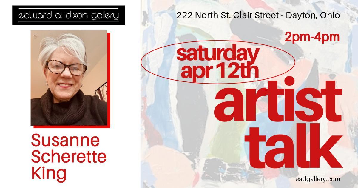 Artist Talk - Susanne Scherette King is taking place at Edward A. Dixon Gallery, which is located at 222 N. St. Clair Street in Dayton. Edward A. Dixon Gallery - A commercial art gallery located in Downtown Dayton that specializes in the exhibition, education, appreciation and sale of Fine Art. Open by appointment and to the public on Friday & Saturday.