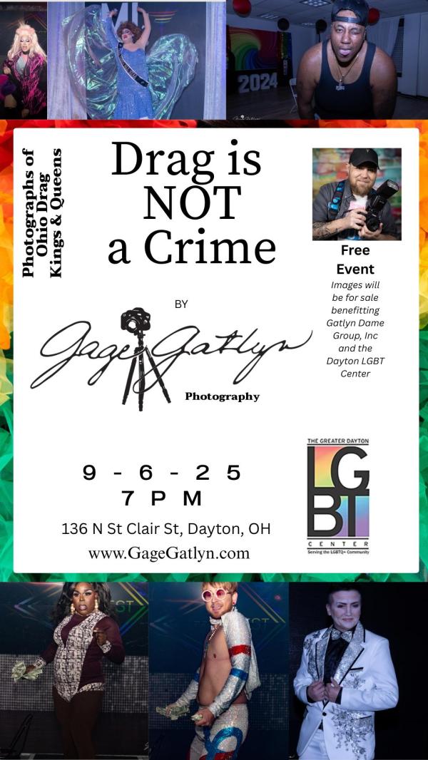 Gage Gatlyn Photography is having an official Exhibit of a few select Drag images he's taken over the last year or two. There will be photographs of entertainers on stage, as well as some of his favorite portraits. Please join us at 7 PM on 9-6-25 for a some snacks and community. This is a FREE event. Donations gladly accepted. Photos will also be for sale. Proceeds benefit Gatlyn Dame Group, Inc & The Greater Dayton LGBT Center.