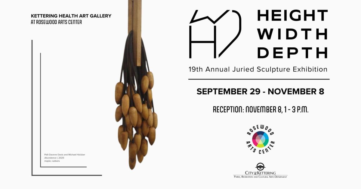Height Width Depth Exhibition Reception is taking place at Rosewood Arts Centre, which is located at 2655 Olson Drive in Dayton. Rosewood Arts Centre - Rosewood Arts Center is dedicated to enriching the quality of life for the residents of Kettering and the greater Dayton area by providing creative experiences through the arts.