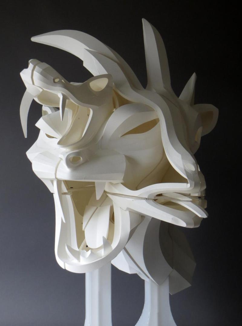 Drawing on fantasy, queer culture, and architecture, Lauer creates demon heads out of paper.